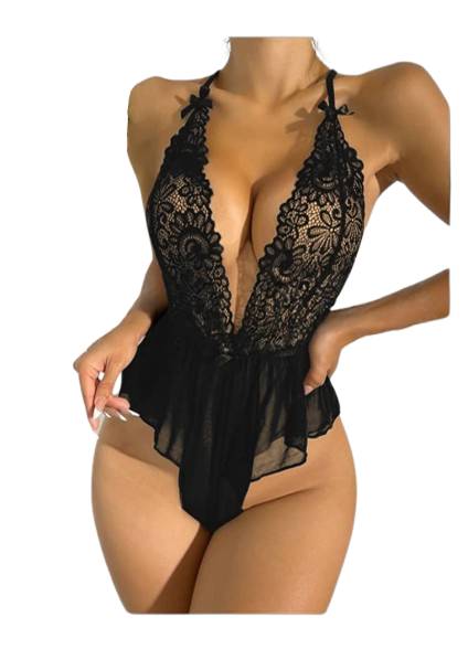 Enhance your femininity with this elegant and seductive black lace teddy. Featuring a deep V-neckline, floral lace cups, and a sheer flowing mesh bottom, this one-piece is designed to highlight your curves and elevate your intimate look.